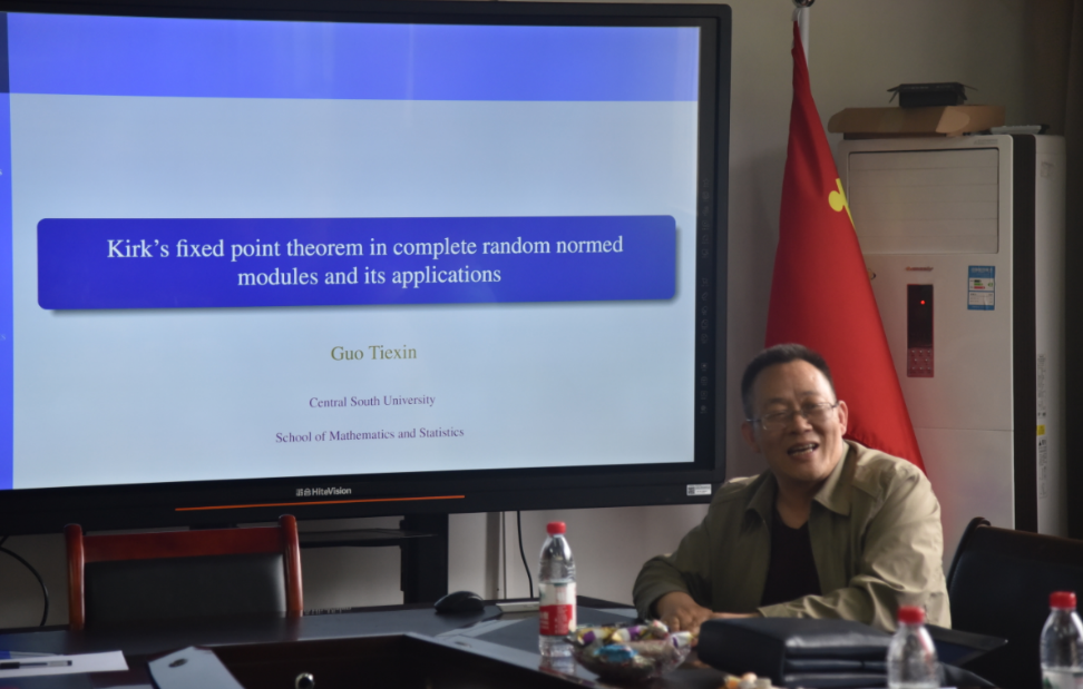 在步教授和程教授的报告之后,专家组进行了一段时间的休息,开始了下午的报告。先由中南大学郭铁信教授带来了题为《Kirk’s fixed point theorem in complete random normed modules and its applications》的报告,他介绍了随机赋范模的发展情况与研究热点、然后介绍了怎样合理定义L0凸紧性、随机正规结构并分别给出它们的特征,并介绍了随机一致凸的随机赋范模具有随机正规结构等一系列优美而深刻的结果。他给出了随机版本的柯克不动点定理,还介绍了这种不动点定理对倒向随机方程、随机非扩张算子的随机不动点定理的应用等等。最后各位参会老师对郭教授的报告进行深入讨论与交流。