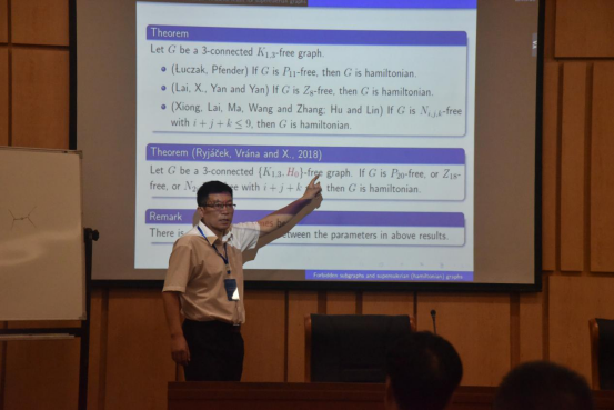 开幕式结束后,会议进入主题报告环节。主题报告环节由美国West Virginia 大学赖虹建教授、beat官网李登信教授、美国Butler大学陈志宏教授、北京理工大学熊黎明教授、新疆大学吴宝音都仍教授、艾尔肯教授及太原理工大学杨卫华教授等主持。美国Butler大学陈志宏教授、北京理工大学熊黎明教授等16位欧拉图课题研究学者就欧拉图研究新成果进行了广泛交流,并就欧拉图课题新问题进行了发布和研讨。其中陈志宏教授题为“Catlin’s reduction method and structure of reduced graphs”的报告和福州大学刘清海博士题为 “Regularity Lemma and Supereulerian Digraphs”的报告更是引起参会学者的激烈讨论。在主题报告结束后,参会学者还就欧拉子图各方面的内容进行了交流与讨论。