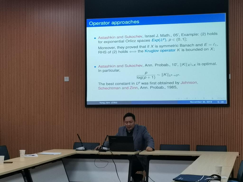 2019年11月30日下午4:10,中南大学焦勇教授应公司蔺友江教授邀请,在新图书馆会议中心二会议室做了题为《Rosenthal’s inequalities: Delta