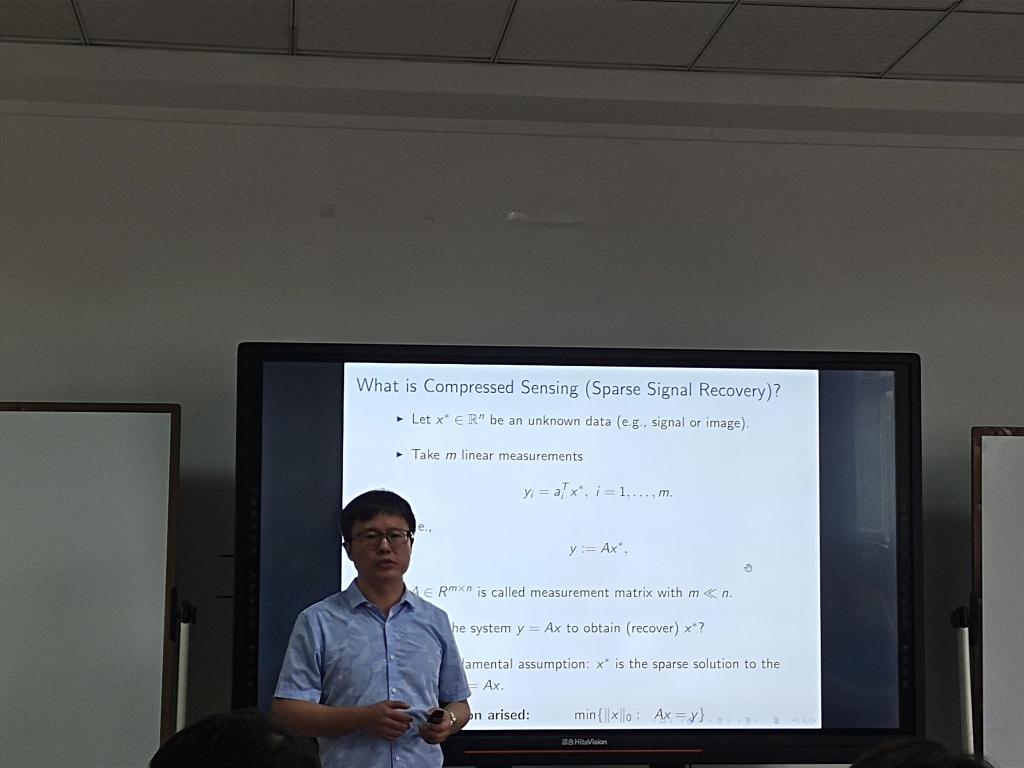 赵云彬教授首先介绍了稀疏优化的研究背景;其次介绍了几种求解稀疏优化问题的方法;;最后给出了几种新的算法并证明了算法的收敛性。赵云彬教授的报告深入浅出,内容丰富,对相关老师开拓新的研究领域具有重要意义。讲座结束后,赵教授同在场的老师和同学进行了交流。