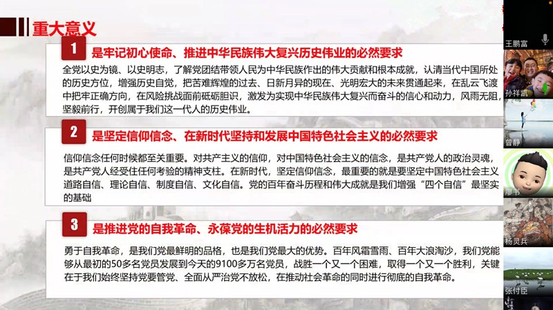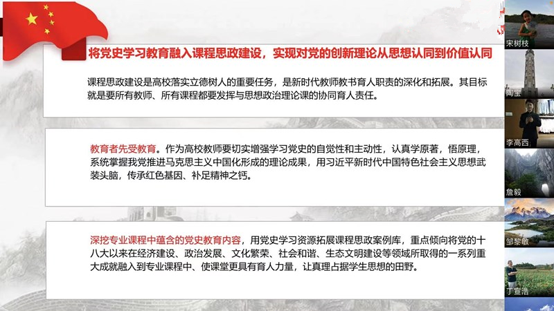 “党的历史是最生动、最有说服力的教科书”。孙祥凯同志首先着重解读了“党史教育学习的重大意义”和“党史教育学习的关键要求”,随后以党史学习教育如何贯穿高校立德树人全过程为主轴,深入浅出地阐述了高校教师党员开展党史学习教育的重要性,并激励全体党员在工作中要深挖专业课程中蕴含的党史教育内容,将党史教育学习有机的融入课程思政建设过程中,要激励员工学党史、知党恩、跟党走,争做担当民族复兴的时代新人。