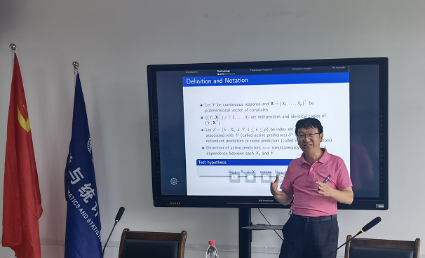 唐教授首先介绍了传统的变量选择方法,接着介绍了惩罚方法和特征筛查等超高维变量选择方法,并对信号较弱且噪音变量较多的超高维问题提出了稳健多重检验方法:通过将连续变量转化成列联表,利用卡方分布的生存函数代替尾部概率,借助样本分位数建立了Pearson卡方检验统计量,建立了虚假发现比估计方法,应用独立删查方法选择重要变量,发展了稳健多重检验统计量和虚假发现比估计的渐近理论,还对对多家股市上市公司的回报作了基于分位数相关的变量选择实证研究。唐教授的精彩报告给与会师生带来新的研究方法和研究思路,激发了青年学子积极从事高水平统计研究的热情。最后唐教授和青年师生分享了教书育人、员工培养和论文写作等方面的成功经验和心得体会,尤其是在高质量论文发表方面提供了非常好的建议,与会师生纷纷表示受益匪浅。