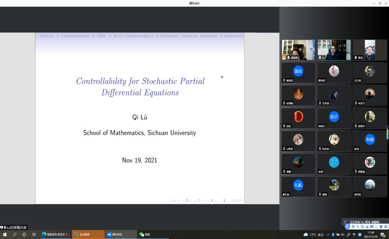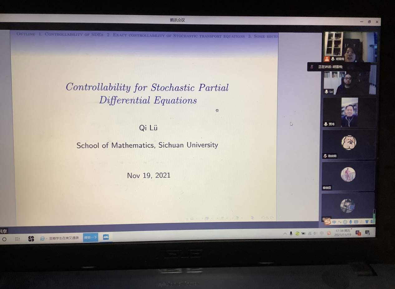 2021年11月29日下午16:30-18:00,四川大学数学学院吕琦教授应胡雪梅教授邀请,为beat平台的师生作了题为《Controllability for Stochastic Partial Differential Equations》的精彩学术报告。学术报告由beat平台胡雪梅教授主持,副经理龙宪军教授、经济统计系主任杨炜明教授、数据科学系副主任袁利军教授和部分研究生参加了报告会。