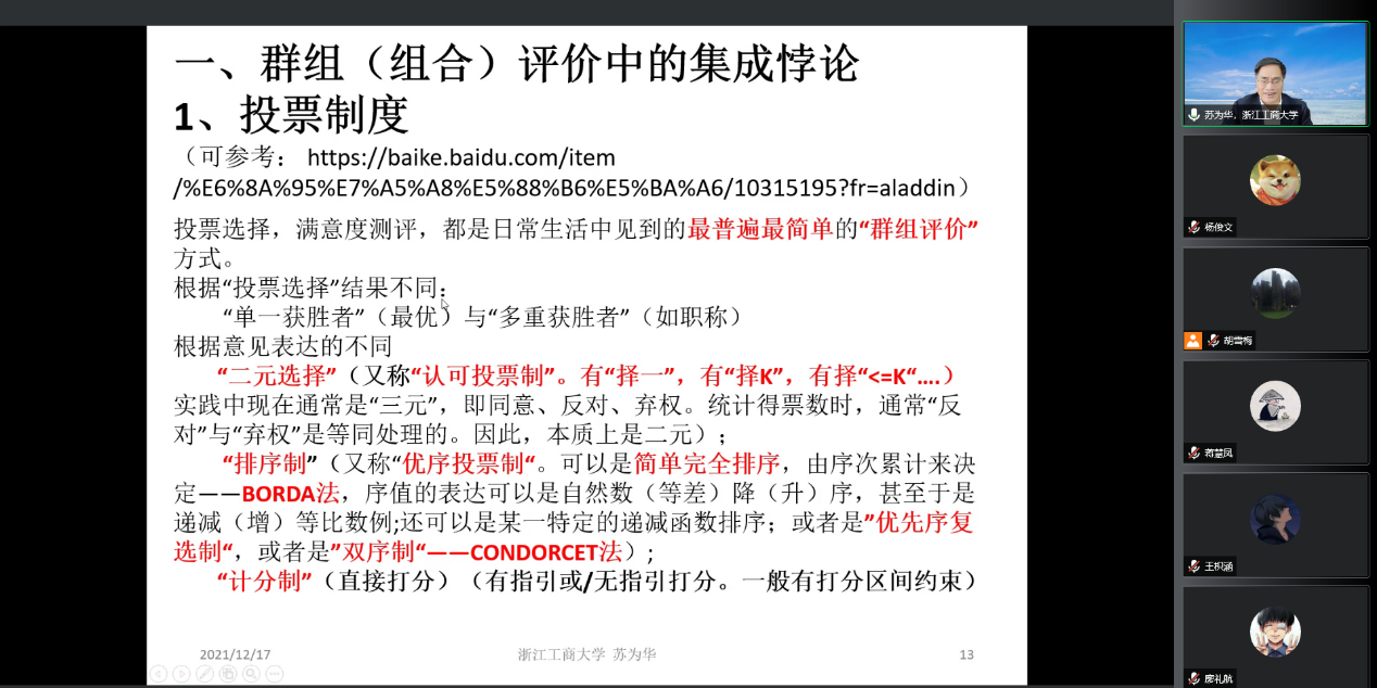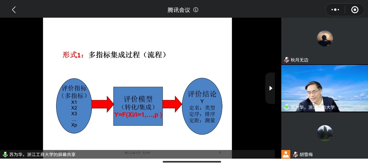 2021年12月17日周五下午15:00-16:30,浙江工商大学副董事长苏为华教授应胡雪梅教授邀请,为beat官网数统学院的师生作了题为《综合评价的集成困境》的精彩学术报告。报告由beat平台经理陈义安教授主持,副经理龙宪军教授、胡雪梅教授、黄应绘教授、杨炜明教授、杨宜平教授、赵培信教授、赵文强教授等中青年骨干老师和统计专业的研究生、2021级本科生等70余人参加了报告会。