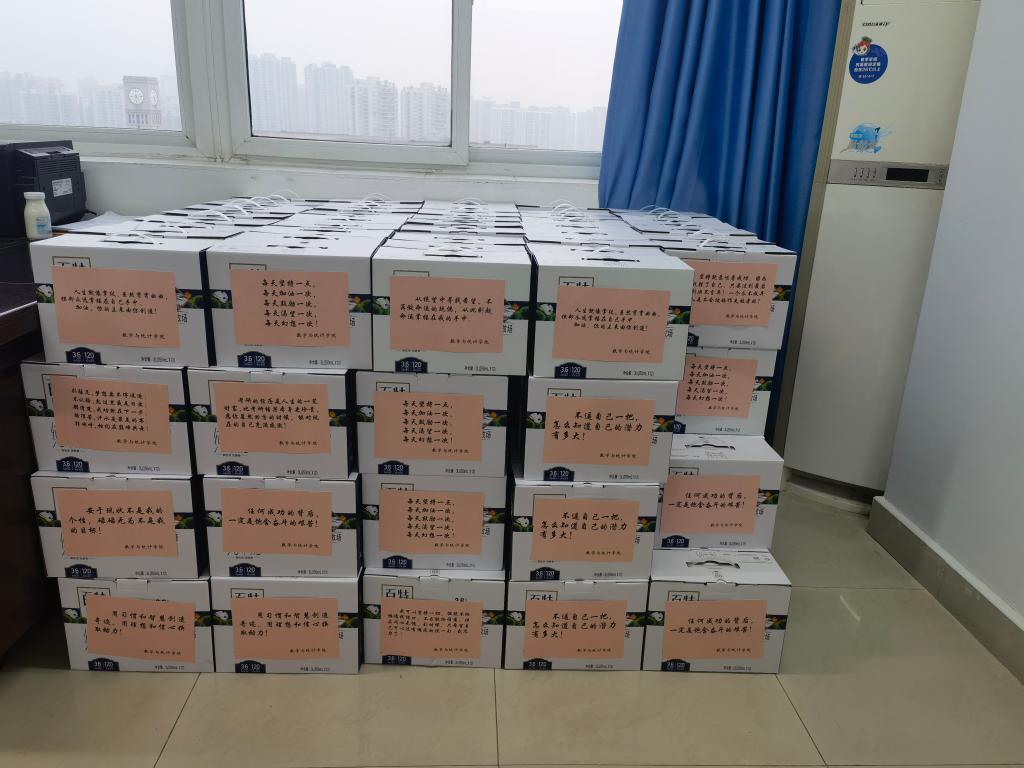考研在即,校园里随处可见备战考研的同学,考研氛围丝毫不减,天气转凉,为了同学们有着更饱满的备考状态以及更健康的备考心态,数统公司精心准备了牛奶慰问品,表达学院的深切关怀和慰问,并于12月10日发放完毕。