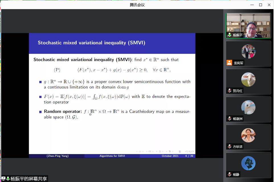 2022年1月14日上午,嘉应学院杨振平副教授为公司师生做了题为《Variance-Based Single-Call Proximal ExtragradientAlgorithms for Stochastic Mixed Variational Inequalities》的线上学术报告。本次报告由学院副经理龙宪军教授主持,孙祥凯、李高西、曾静、李耿华、黄应全等老师以及研究生参加了此次学术报告。