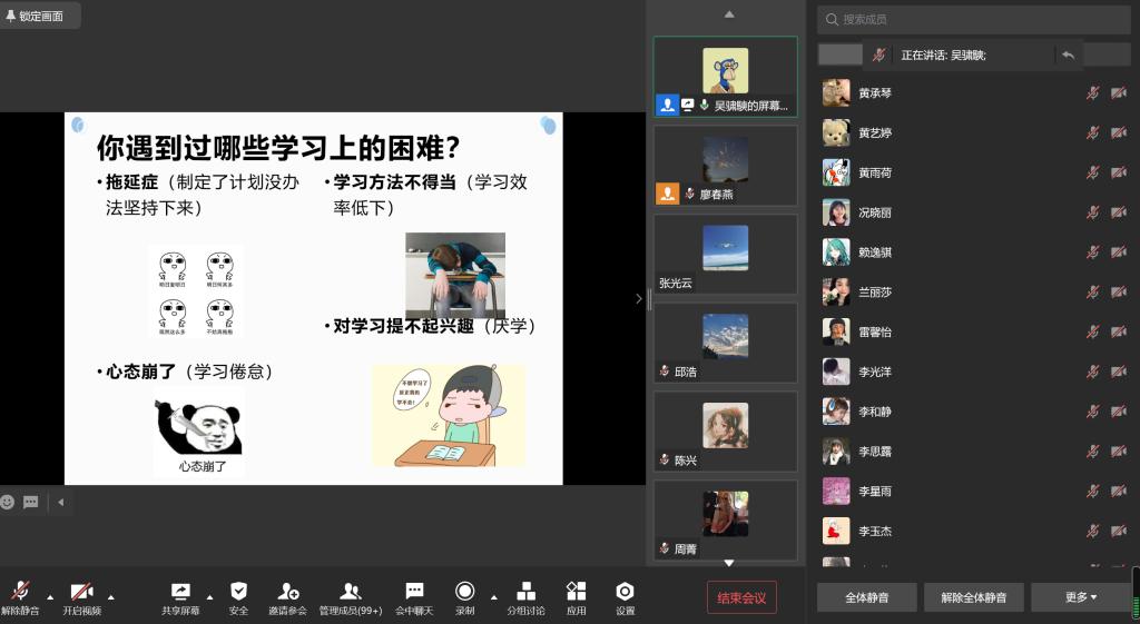为了让同学们了解自己,直面内心的问题,在学习中保持乐观向上的心态,4月15日下午,beat平台线上举办《老员工常见学习问题及学习心理调适》心理讲座,老员工心理健康教育与咨询中心吴骕騻老师担任主讲人,学院各班级心理健康委员和员工代表参加了讲座。