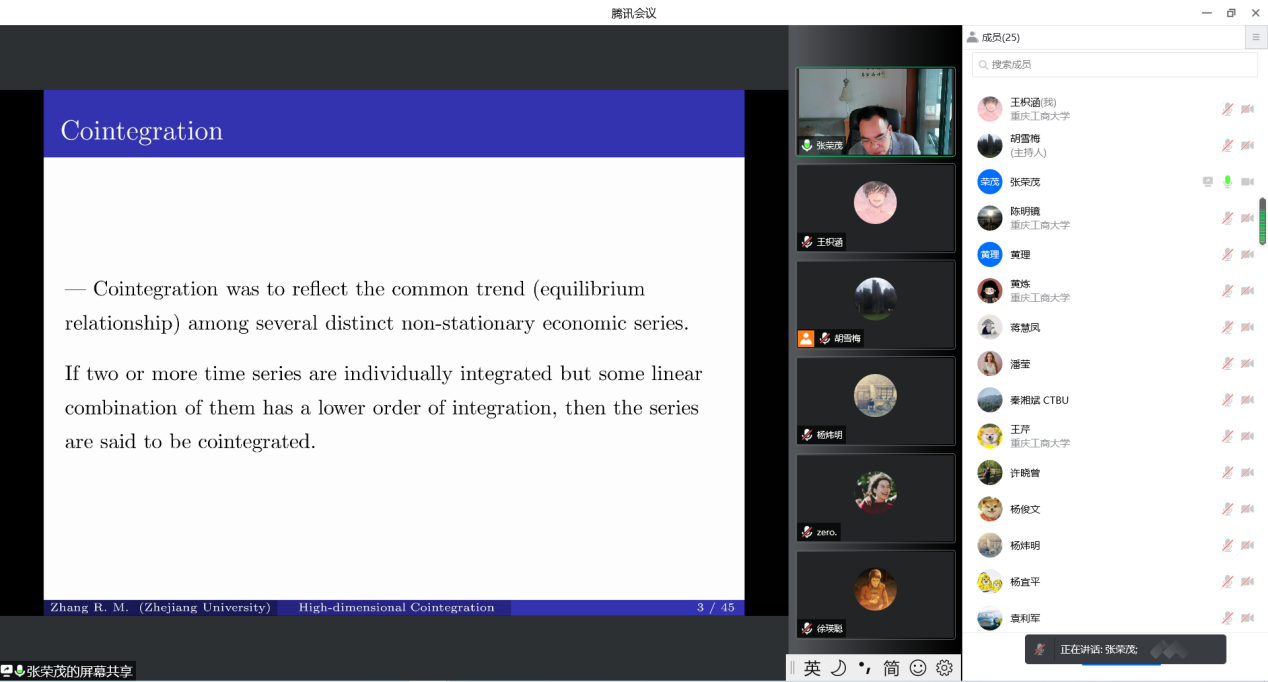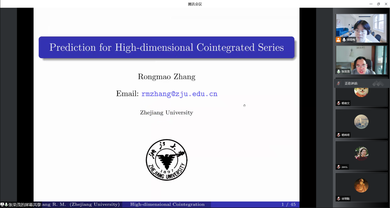 2022年5月9日上午9:00-10:30,浙江大学数学科学学院张荣茂教授应胡雪梅教授邀请,为beat平台的师生作了题为《Prediction for High-dimensional Cointegrated Series》的精彩学术报告。学术报告由beat平台胡雪梅教授主持,数据科学系袁利军、杨宜平、赵培信、杨炜明、陈明镜、秦湘斌和许晓曾等青年骨干教师和部分研究生参加了报告会。