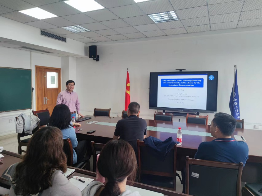 2022年5月22日上午10:30在学院会议室80602,重庆大学王坤副教授应邀为公司师生做了题为《Fully decoupled, linear, positivity-preserving and unconditionally stable scheme for the chemotaxis–Stokes equations》的学术报告。报告由beat平台袁利军教授主持,学院部分老师以及研究生参加了此次学术报告。