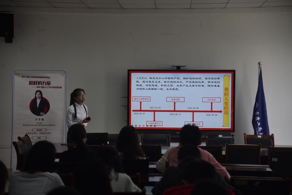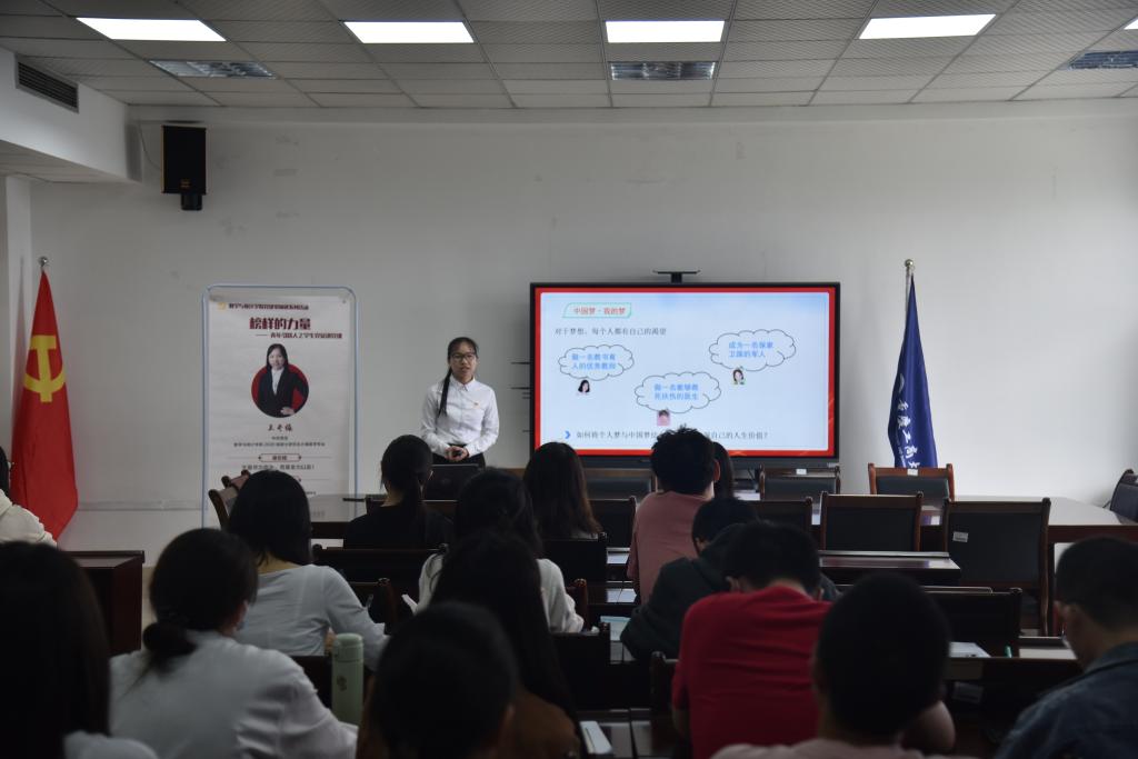 她说道,从加入中国共产党那一刻起,自己就多了一个身份,党员身份要求她必须要履行好党员义务,发挥好模范作用。她向大家讲述了自己在逐梦过程中,不断努力考取教团队格证的经历和大学期间为实现目标而不断奋斗的历程。她分享道,每个阶段要有每个阶段的目标,有目标才有压力,有压力才有动力,有动力才能发掘出潜力,才能遇见更好的自己。她展示了自己研究生学习期间取得的成绩和实现的目标,以此激励同学们将个人的梦想与中国梦结合起来,把创新精神与科学发展结合起来,把仰望星空与脚踏实地结合起来,为实现伟大复兴的中国梦奉献自己的青春,贡献自己的力量。