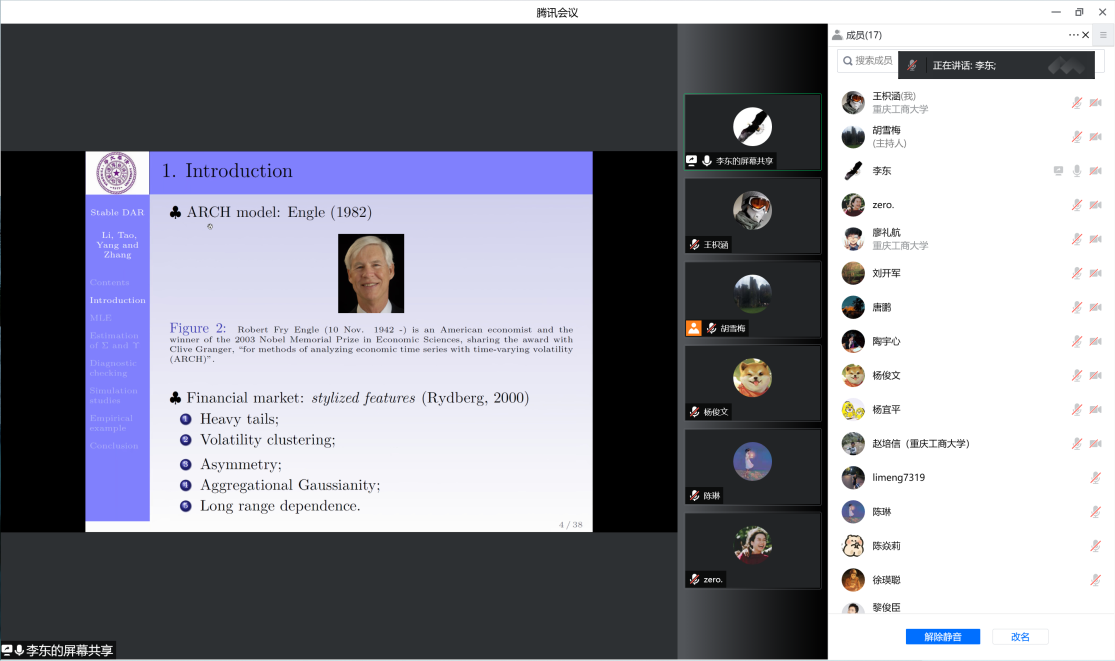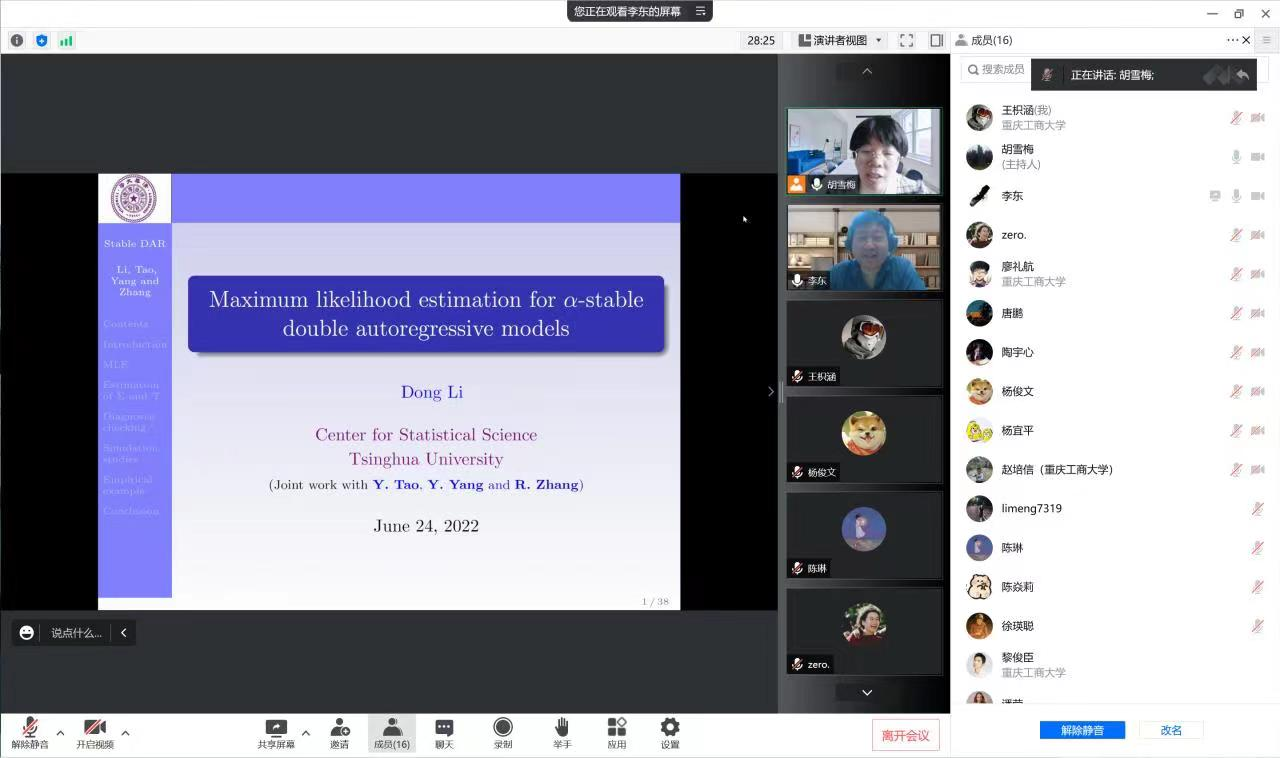 2022年6月24日星期五上午10:30,清华大学统计学研究中心李东副教授应胡雪梅教授邀请,为beat平台的师生作了题为《Maximum likelihood estimation for alpha-stable double autoregressive models》的高水平学术报告。学术报告由beat平台胡雪梅教授主持,赵培信教授、杨宜平教授、程素丽博士等骨干老师和部分研究生参加了报告会。