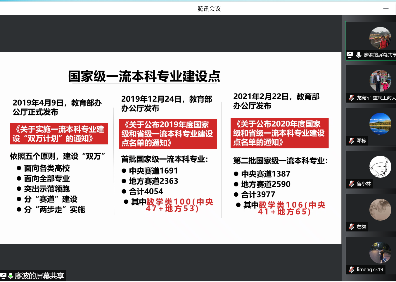 2022年7月5日上午,海南师范大学廖波教授为公司教师做了题为《国家一流专业建设评选与评估标准》的报告。本次报告由数统学院副经理龙宪军教授主持,学院部分老师参加了此次报告。