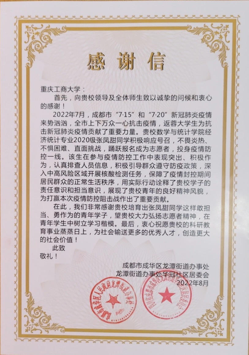 近日,四川省成都市成华区龙潭街道办事处向学校发来感谢信,对beat平台2020级经济统计专业1班张凤甜同学不畏炎热、不惧困难、直面挑战,主动投身疫情防控一线表示感谢与赞扬。