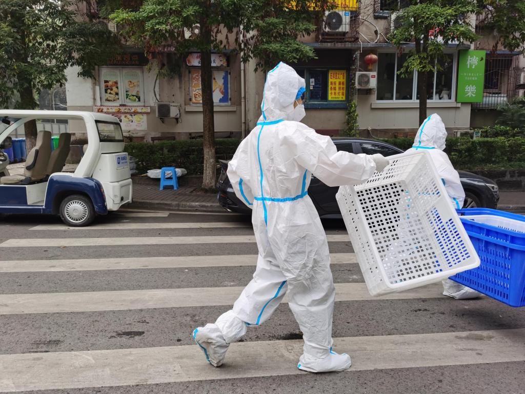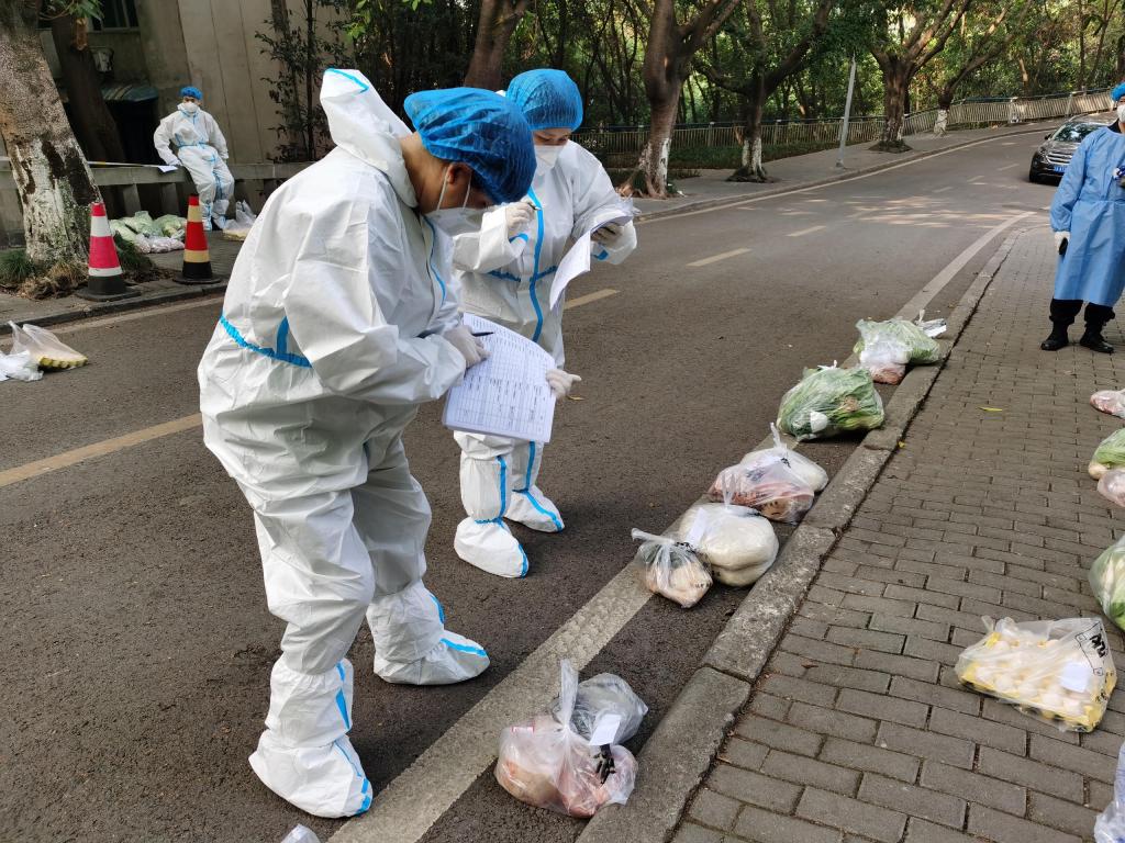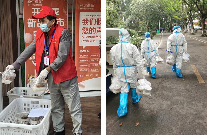 在兰花湖承担送餐工作的张明平老师第一天送餐就连续工作4小时,脱下防护服后才发现自己浑身湿透,汗流浃背,趁短暂休息的间隙,他赶紧给自己进行了核酸自测,他知道这样的日子可能还会持续很久,匆忙解决完午饭后马上又投入了下一拨的送餐工作中。