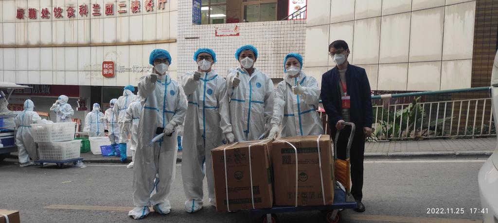 11月19日学校家属区封控的第一天,学院郭盛亮老师和秦湘斌老师就第一时间报名成为家属区首批志愿服务队成员,他们承担了为家属区封控楼栋上门送餐、送生活物资、核酸检测等任务,第一次穿上防护服的秦湘斌老师深感责任重大,使命光荣,他不断告诉自己无论多么艰难都要坚持服务下去,为守护工商平安贡献自己的力量。他用这份执着的信念在家属区连续服务10天。