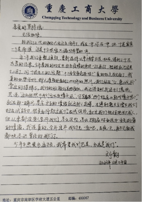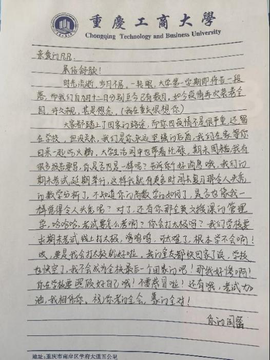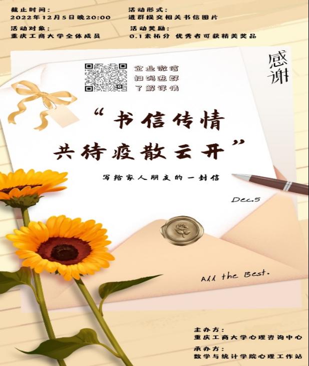本次书信心理主题活动丰富了大家的课外校园生活,倡导同学们积极配合学校疫情防控要求,遵守校园封闭管理规定,主动承担起疫情防控职责,为疫情防控工作贡献青年智慧与力量。