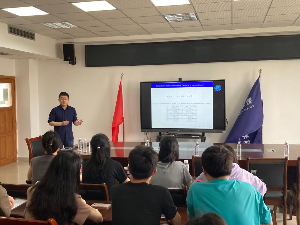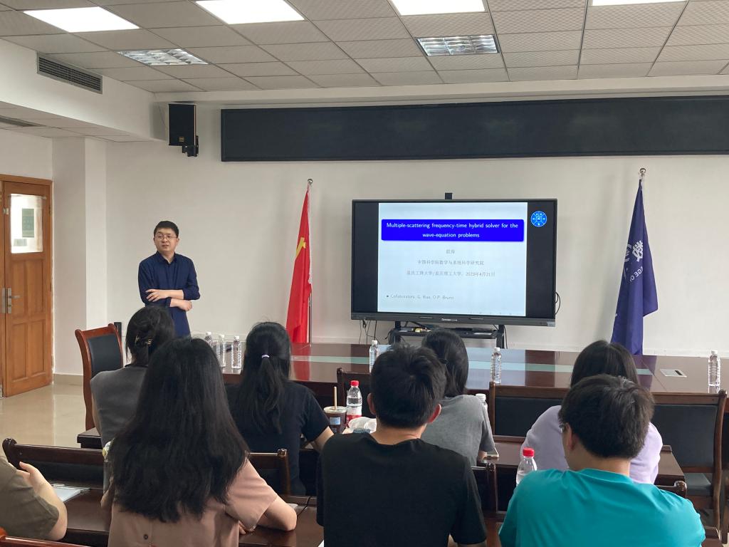 2023年4月21日下午,中科院计算数学与科学工程计算研究所殷涛副研究员在启智楼80602学院会议室做了题为《Multiple-scattering frequency-time hybrid solver for the wave-equation problems》的学术报告。本次学术报告由beat平台袁利军教授主持,邹黎敏副教授、李耿华副教授、谢江明博士等骨干老师和计算数学、统计学方向的研究生参加了此次学术报告会。