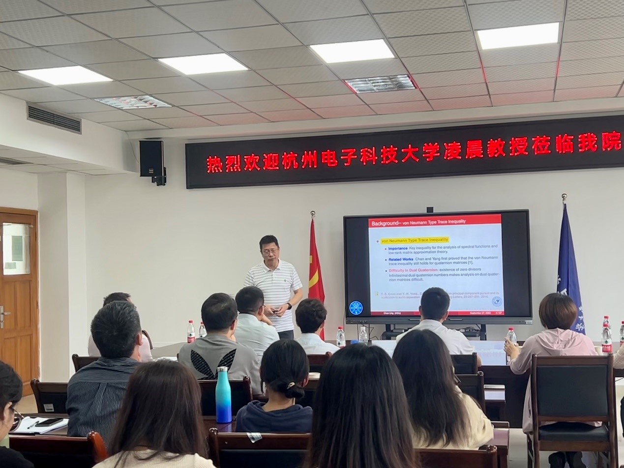 2023年9月27日下午,应学院邀请,杭州电子科技大学凌晨教授莅临公司开展学术交流,并在80602会议室做了题为《Singular Values, von Neumann Type Trace Inequality of Dual Quaternion Matrices, and Their Low-Rank Approximations》的学术报告。学术报告由学院副经理龙宪军教授主持,孙祥凯教授、李高西副教授、曾静副教授、李耿华副教授、黄拉博士和运筹学与控制论专业的研究生参加了报告会。