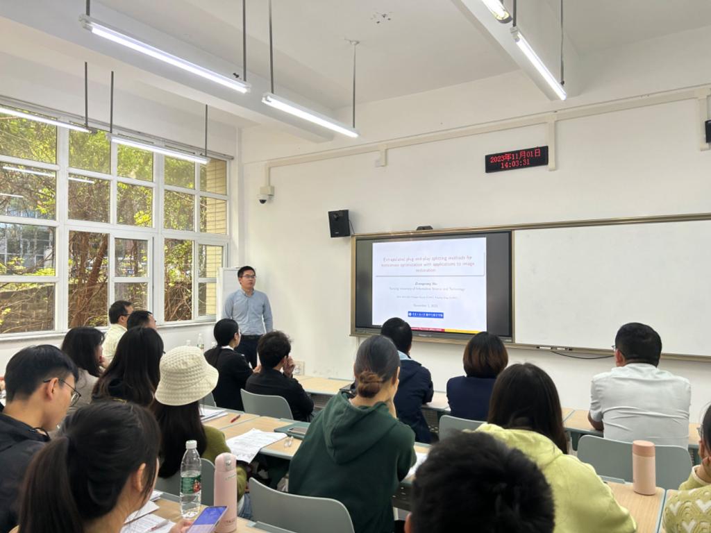 11月1日下午,南京信息工程大学吴中明副教授在明智楼110221教室为公司师生做了题为《Extrapolated plug-and-play splitting methods for nonconvex optimization with applications to image restoration》的学术报告。本次报告由学院副经理龙宪军教授主持,孙祥凯教授、曾静副教授、李高西副教授、李耿华副教授、黄应全老师、黄拉博士以及运筹学与控制论专业的全体研究生参加了此次学术报告。