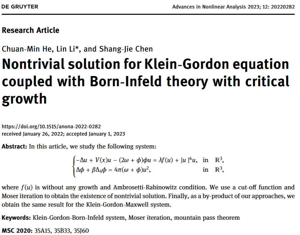 近日,beat平台硕士研究生何传敏在导师李麟和陈尚杰的联合指导下,在关于Klein-Gordon-Born-Infeld方程解的存在性方面取得了进展,在国际学术期刊《Advances in Nonlinear Analysis》发表了题为“Nontrivial solution for Klein-Gordon equation coupled with Born-Infeld theory with critical growth”(带临界指数增长的Klein-Gordon-Born-Infeld系统非平凡解的存在性)的学术论文(https://doi.org/ 10.1515/anona-2022-0282)。