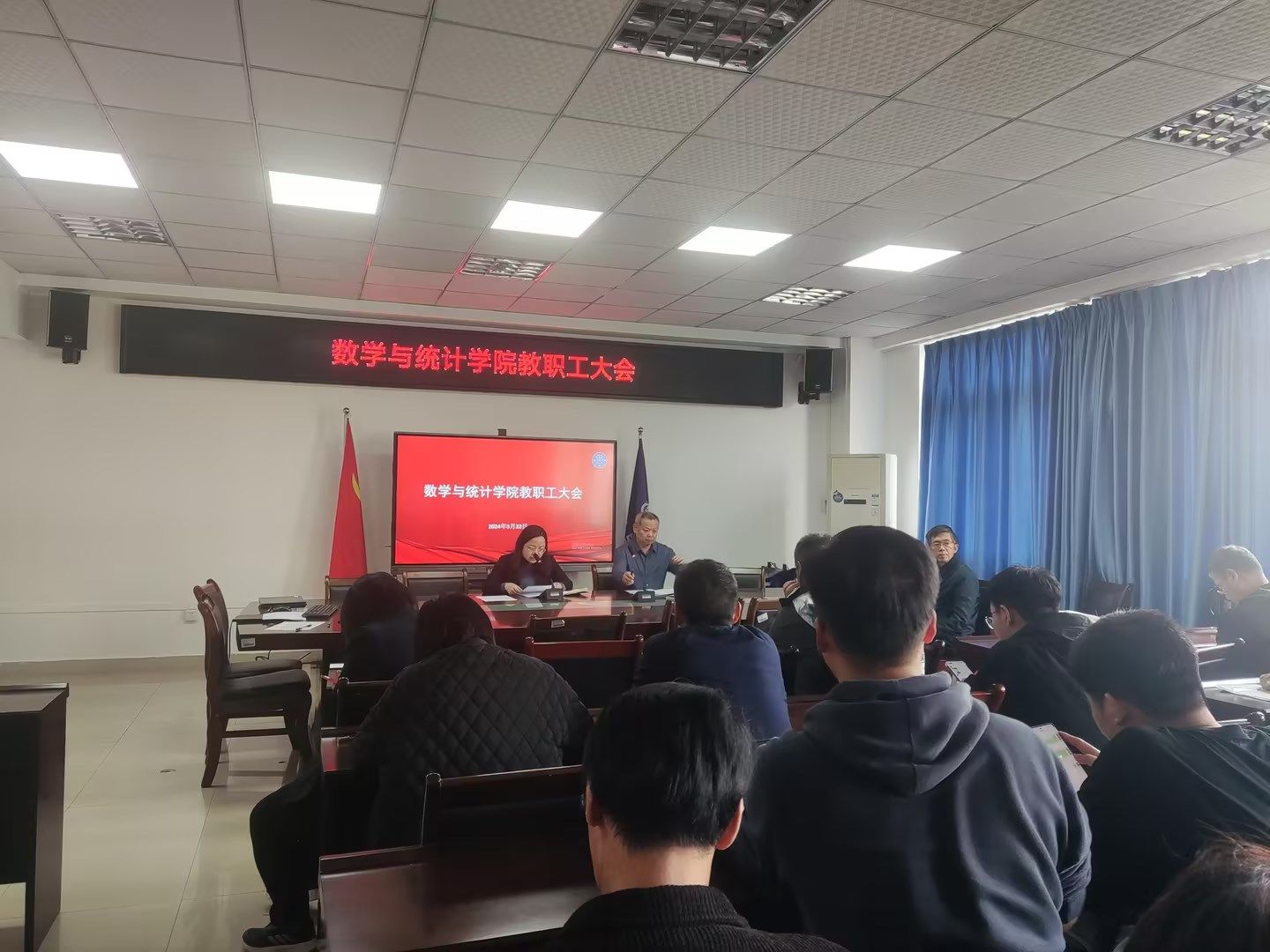 会议第一阶段是全体教职工的政治理论学习,潘焱带领大家学习了2024年两会精神。她首先介绍了两会的情况,结合李强总理做的政府工作报告,分析了当前发展形势,介绍了政府工作报告的要点,并对有关教育部分重点工作与大家分享了学习体会。潘焱指出,希望广大教职工立足工作岗位,担当有为,履职尽责,为推进学校、学院各项事业发展贡献自己的力量。